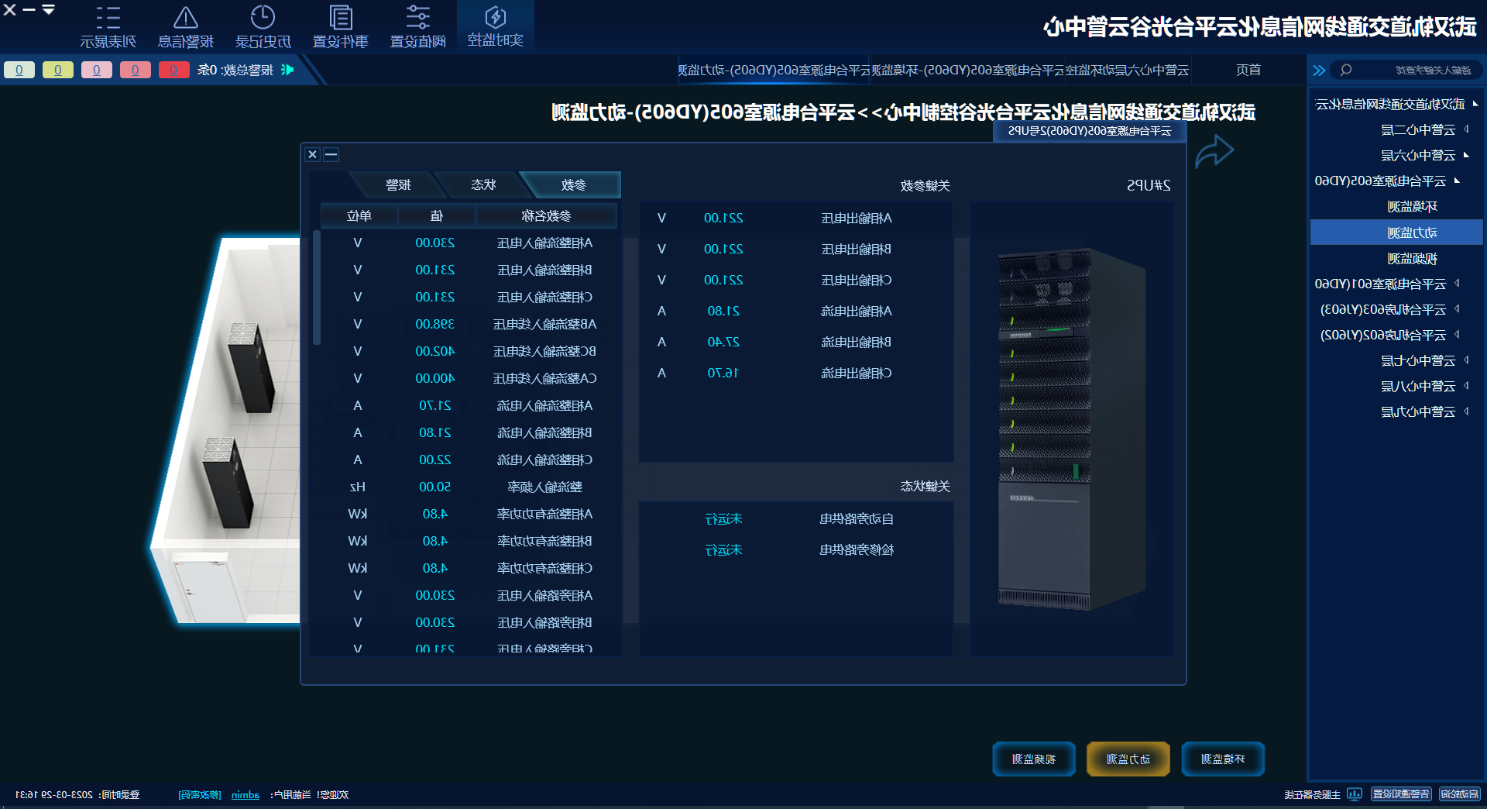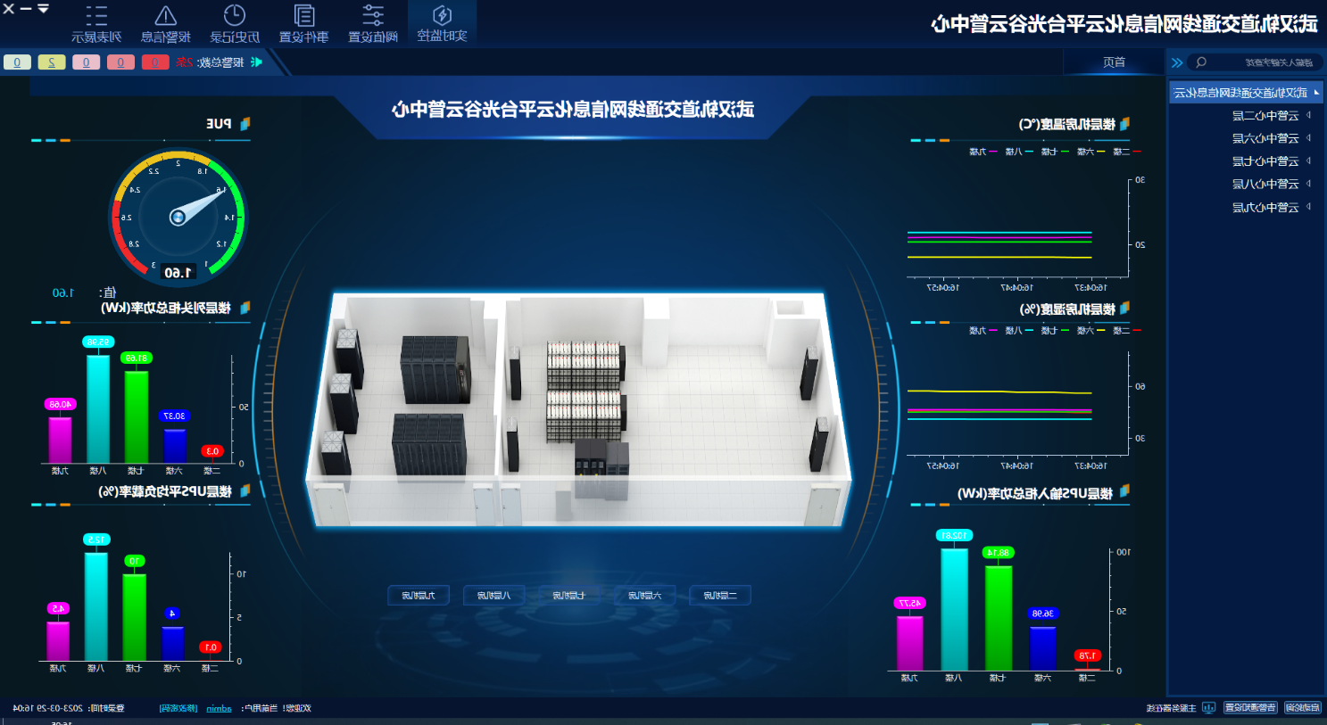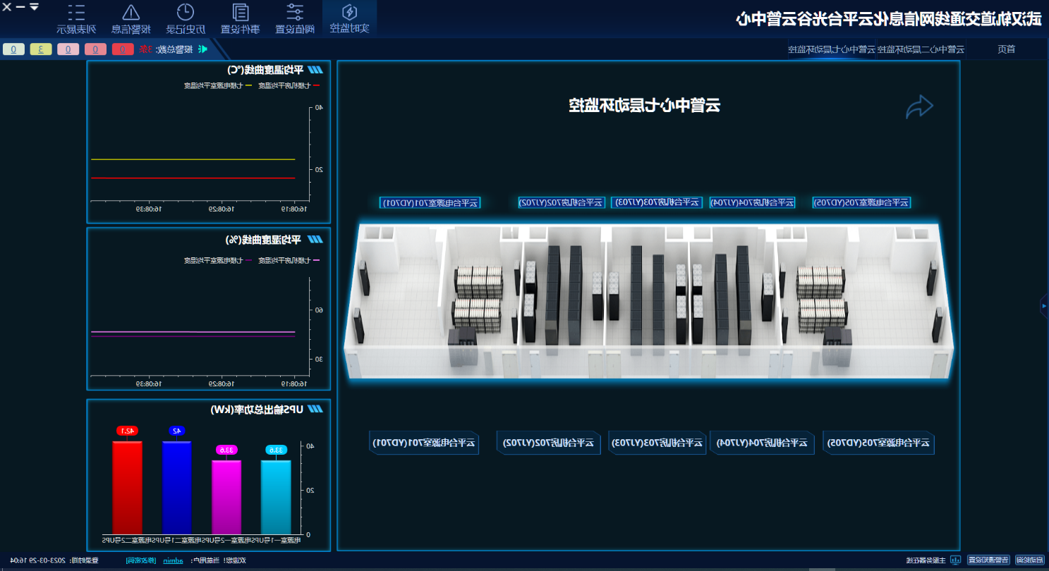 机房动环监测系统依托光谷控制中心、武湖控制中心、光谷云管中心内的基础配套设备,监测配电柜、UPS等设备的工作状态、精密空调漏水检测装置、数据机房及电源室的温湿度监测以及视频监控,形成统一的集中监测系统。通过模拟出云平台项目各机房的实景3D图像,将各个子系统实时运行状态集成在机房操控室电脑客户端,实现运维人员本地监测和异地报警同步的功能。