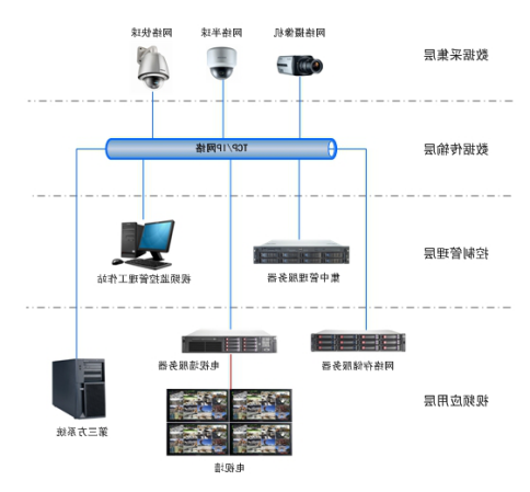 网络视频监控系统由前端数据采集层、数据传输层、控制管理层、视频应用层四个部分组成。数据采集层由网络摄像机或模拟摄像机+编码器的方式组成,主要负责获取视频图像。数据传输层由网络交换机及传输线缆组成,其中网络交换机负责数据交换。控制管理层由集中管理服务器与视频监控管理工作站组成,通过对视频监控管理工作站设置不同的权限,实现对不同权限的用户管理。视频应用层由存储转发服务器、解码服务器组成,主要负责制图像转发、存储及视频输出。