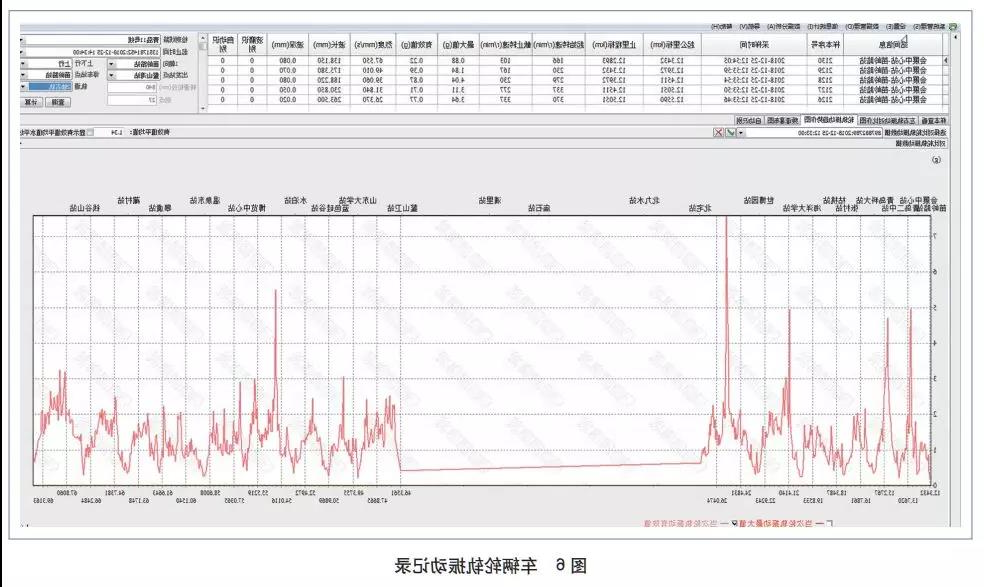 利用车载状态监测设备采集的车辆实时状态数据,并根据系统或部件的历史监控数据,对于专家系统给定阈值内的数据抖动进行变化趋势分析和比对。图 6 显示了车辆走行部轴箱轴承状态监测设备在某运行区间所记录的 2 轴右轨振动数据。在图中 K25+292~K25+400 区 间,最大振动有效值为 7.58g,波磨路段的振动频率为400~450 Hz,未超出系统给定的正常状态阈值,但相较于该轴的历史数据记录,本次振动幅度特别大,因此系统记录下数据变化趋势并发出报警信号,提示检修人员检查该部位走行部状态。