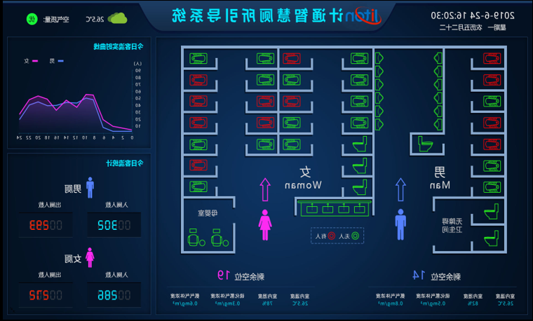 而在现代智慧厕所中,最具特点的就是智慧公厕系统,通过该系统,人们在公厕主入口放置的公厕引导大屏上就可以直观看到公厕男女厕位等设施的分布情况,厕位占用情况环境参数、人流情况等信息。