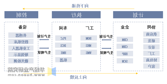智能工厂包含三项流程,可再细分为五个层面,层与层之间相互联系,形成闭环。计划流程包括协同层和企业层,其中协同层指在商业生态环境中,企业与其他参与者进行互动,将各自的实时数据上传至共享平台,形成数据库,企业层指企业内部的生产管理软件从共享平台获取数据并进行分析,展开预测性分析,制定工作计划并排产,向下传达至执行部门;执行层主要负责接发生产任务并执行;控制层主要对对生产设备进行实时监控与中期检测,保证产品质量,协助必要维修工作。