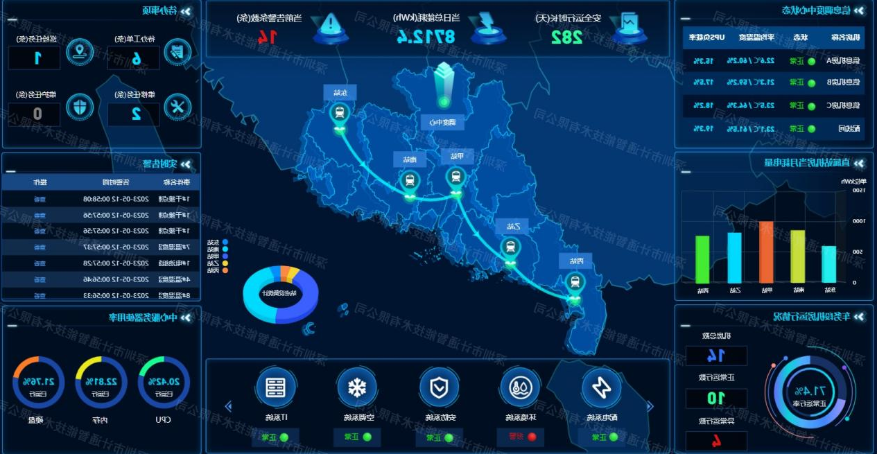 针对线网站点机房数量多、分布广等运维现状,利用物联网、人工智能、大数据分析、数字孪生、地理信息等技术实现对线网各站点机房的配电、环境、动力、安防等进行集中监控、智能分析、高效运维等综合管理。