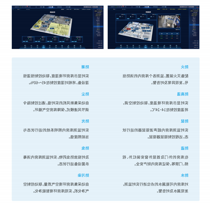 智能在档案馆、档案室、库房等场景关键区域部署环境感知设备及数据采集设备,通过对应的标准接口及协议实现对设备的数据流、控制流、告警流、视频流的集成管理,实时获取设备的运行参数、状态及记录,满足集中监测、远程控制、互联互通等功能要求,实现智慧档案库房的“十防”监控。
