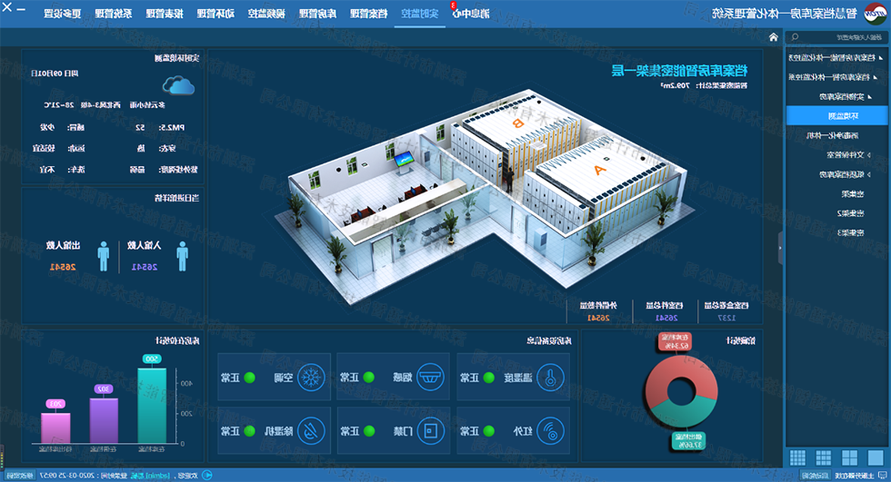 通过数据采集和网络传输的方式,将各自独立的环境设备的运行指标、参数等数据集中存储、查询和监控,同时对于异常数据采用多种报警方式,缩短判断故障的时限,提高解决故障的能力,达到实时记录和监控、有效预警和报警,实现对档案库房环境系统的综合、安全和无人值守的高效管理,为档案库房整体的环境、安防及门禁视频提供7x24不间断监测与科学管控。
