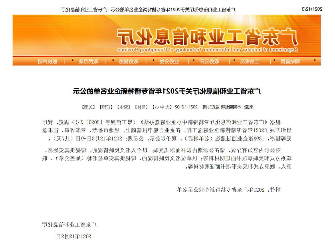 近期,广东省工业和信息化厅关于2021年省专精特新企业名单公示,深圳市J9国际品牌 智能技术有限公司(以下简称“深圳J9国际品牌 ”)名列其中。