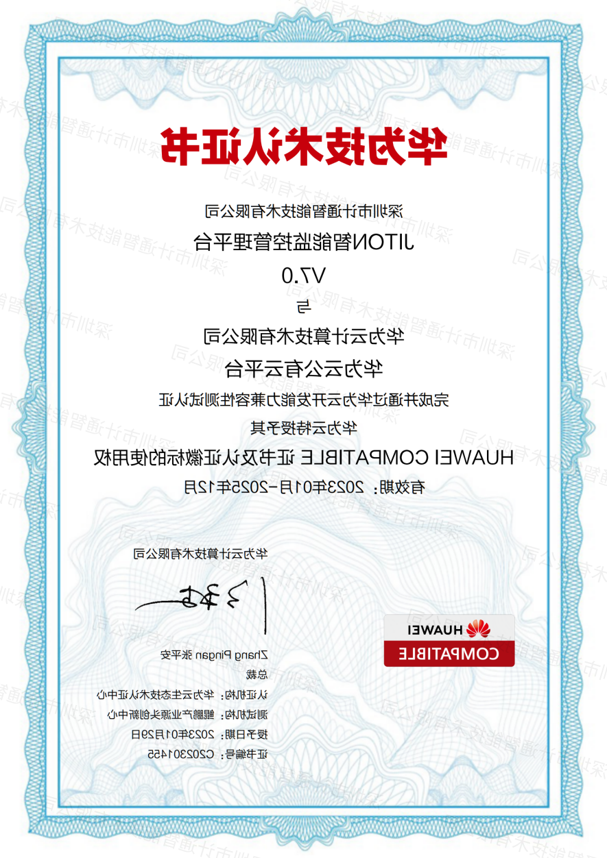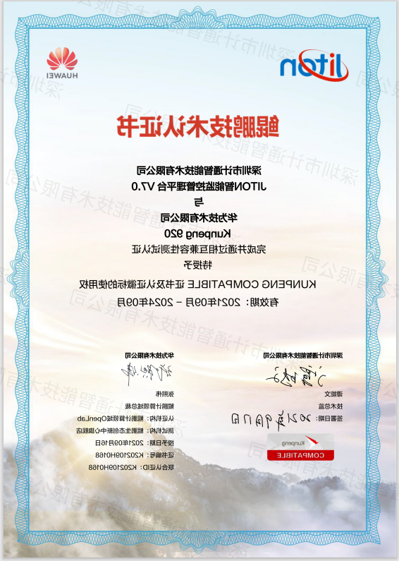 ·HUAWEI COMPATIBLE证书致力于第三方厂商产品与华为互操作和互联互通测试以保障双方产品能够兼容运行,为客户提供既定的产品功能。它的获取表明“JITON智能监控管理平台V7.0”具有业内认可的高兼容性、实用性和稳定性。