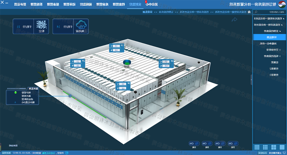 档案库房三维立体监控以档案库房实际场景为原型,通过先进的三维建模技术,搭建与档案库房、设备实际情况等比例的三维仿真监控模型,进行虚拟展示。系统将不同设备各种监控数据集中发布,集海量信息于同一个平台,供用户进行查看、交互、分析,并可实现对库房自动巡检功能。